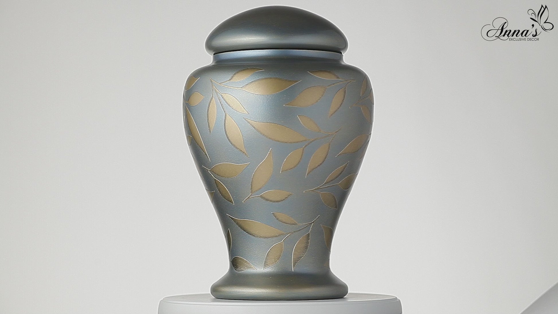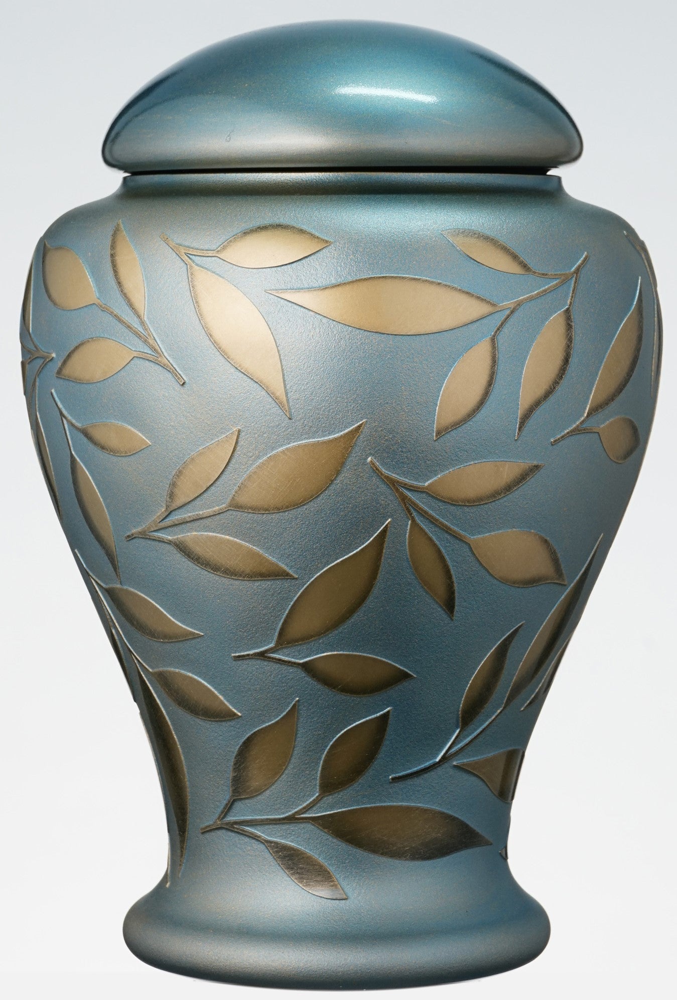 - TIMELESS DESIGN: the blue sleek body is accented with etched and painted GOLDEN LEAVES to allow for a beautiful and everlasting display in memory of your loved one and celebrating their life at the funeral, home or at the columbarium. Let this artistic urn help keep all the cherished memories of your loved one alive.