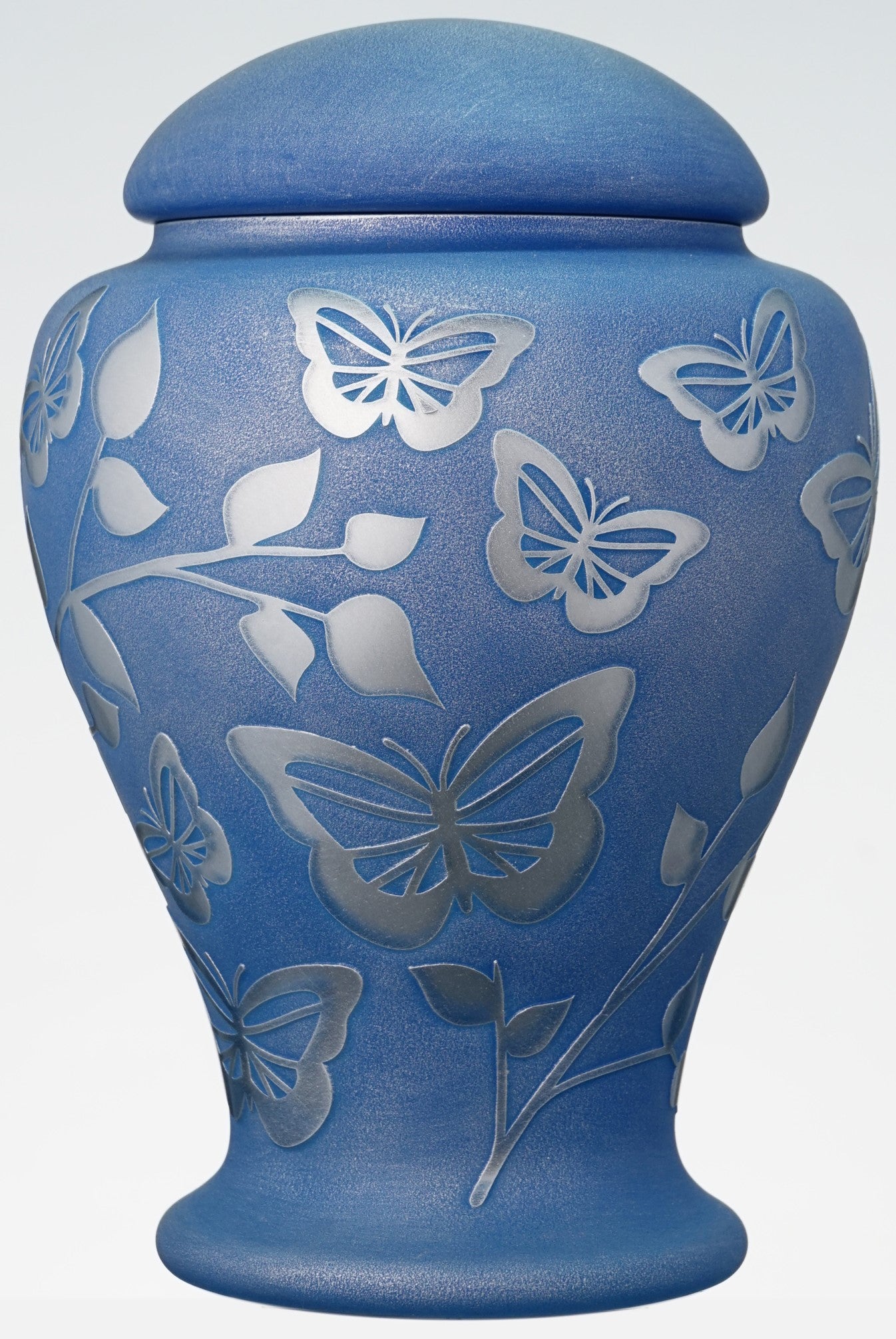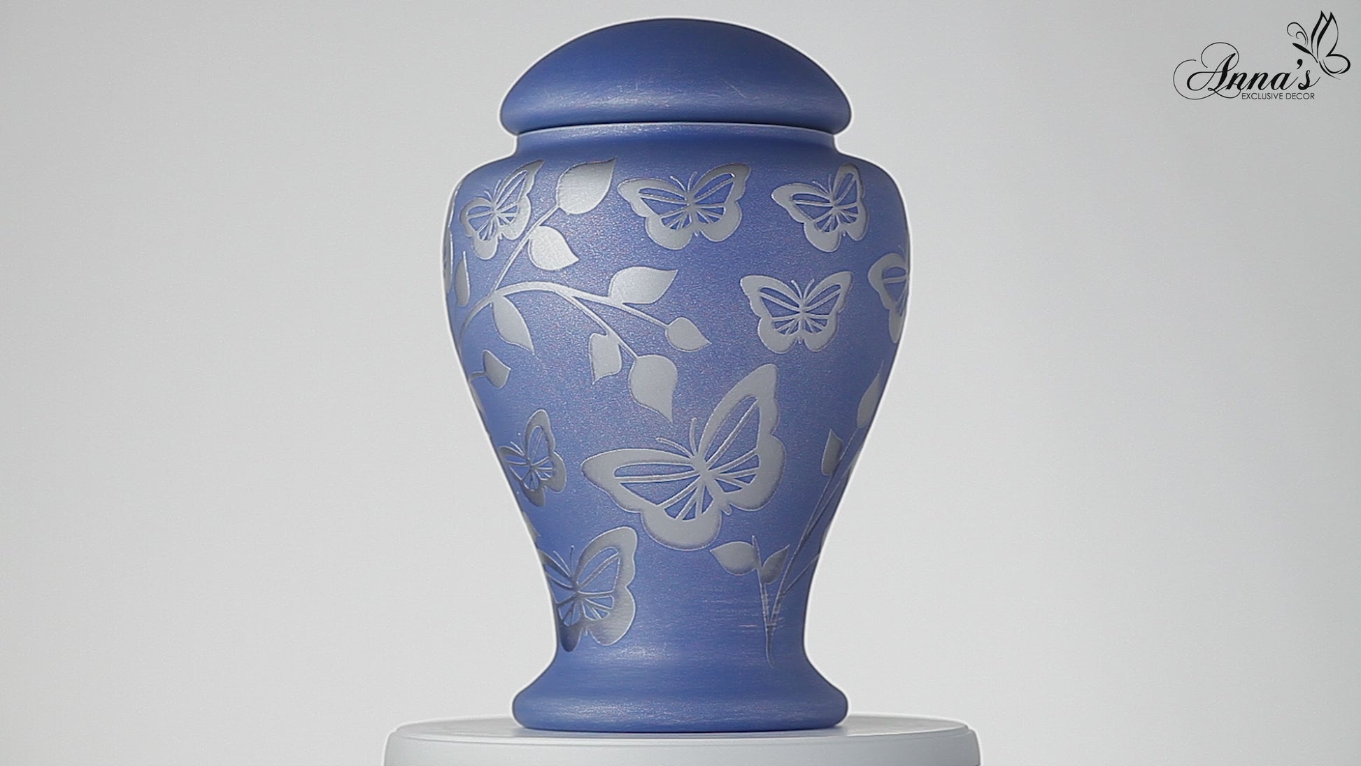 - TIMELESS DESIGN: the blue sleek body is accented with etched and painted SILVER BUTTERFLIES and LEAVES to allow for a beautiful and everlasting display in memory of your loved one and celebrating their life at the funeral, home or at the columbarium. Let this artistic urn help keep all the cherished memories of your loved one alive.